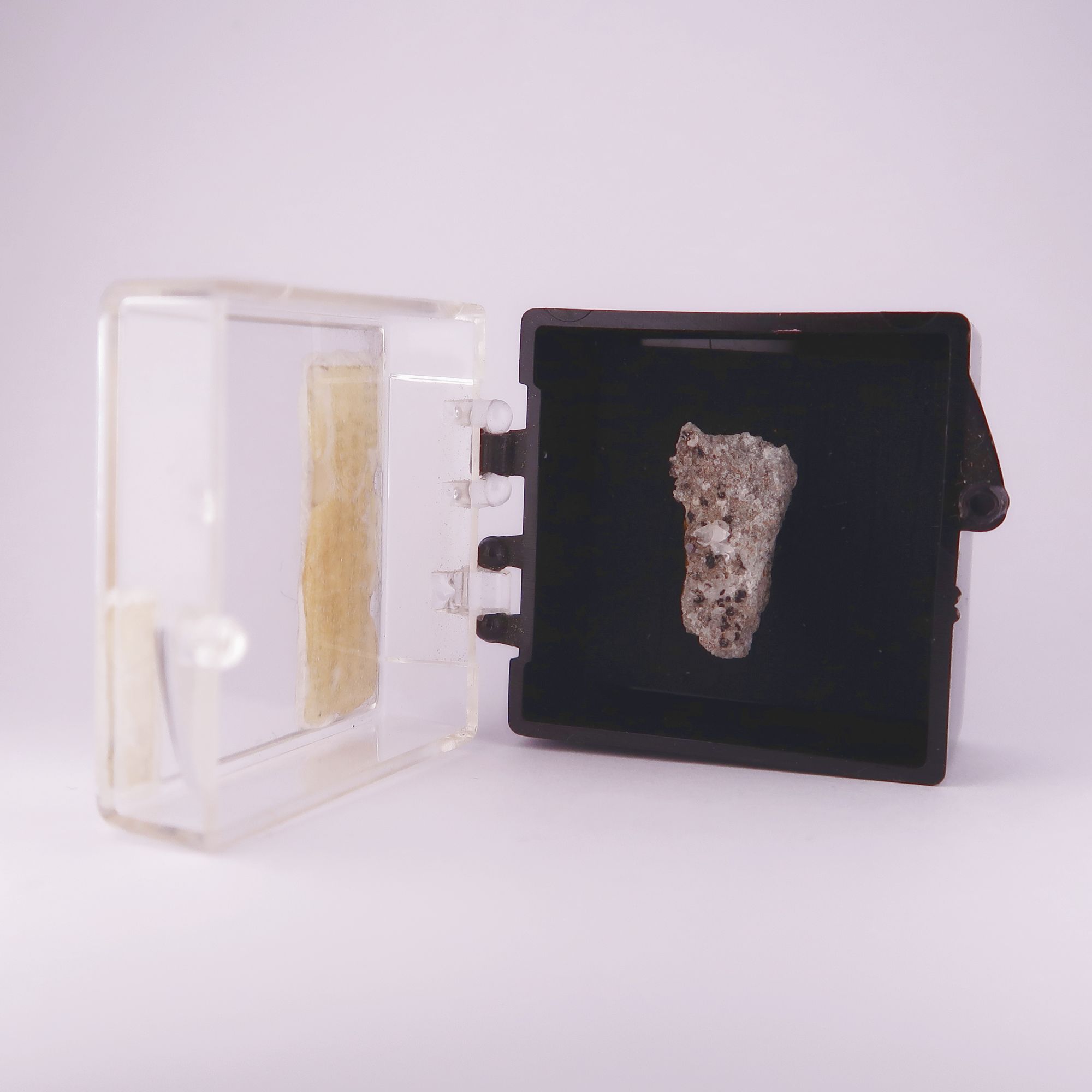 #1 - This specimen was part of Roger Harkers collection and has two of his labels glued to the perky box it comes mounted in. There would have originally been a larger label with more info including previous owners on the bottom of this box, but unfortunately due to poor storage conditions it has fallen off and been lost.