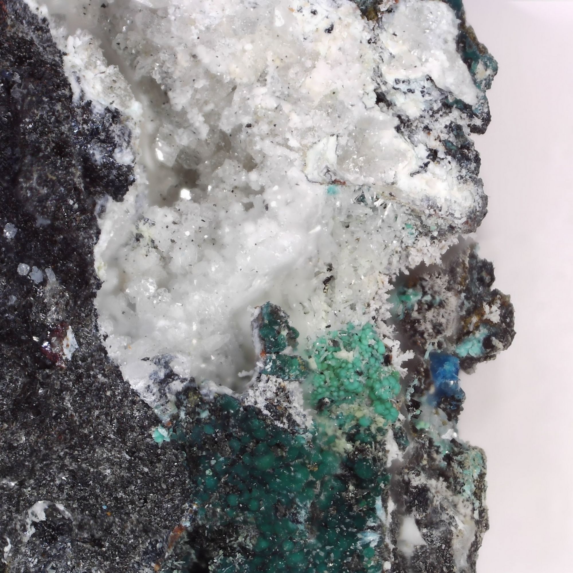 Micro specimen of anglesite and malachite on slag matrix from the Meadowfoot Smelter, Scotland.