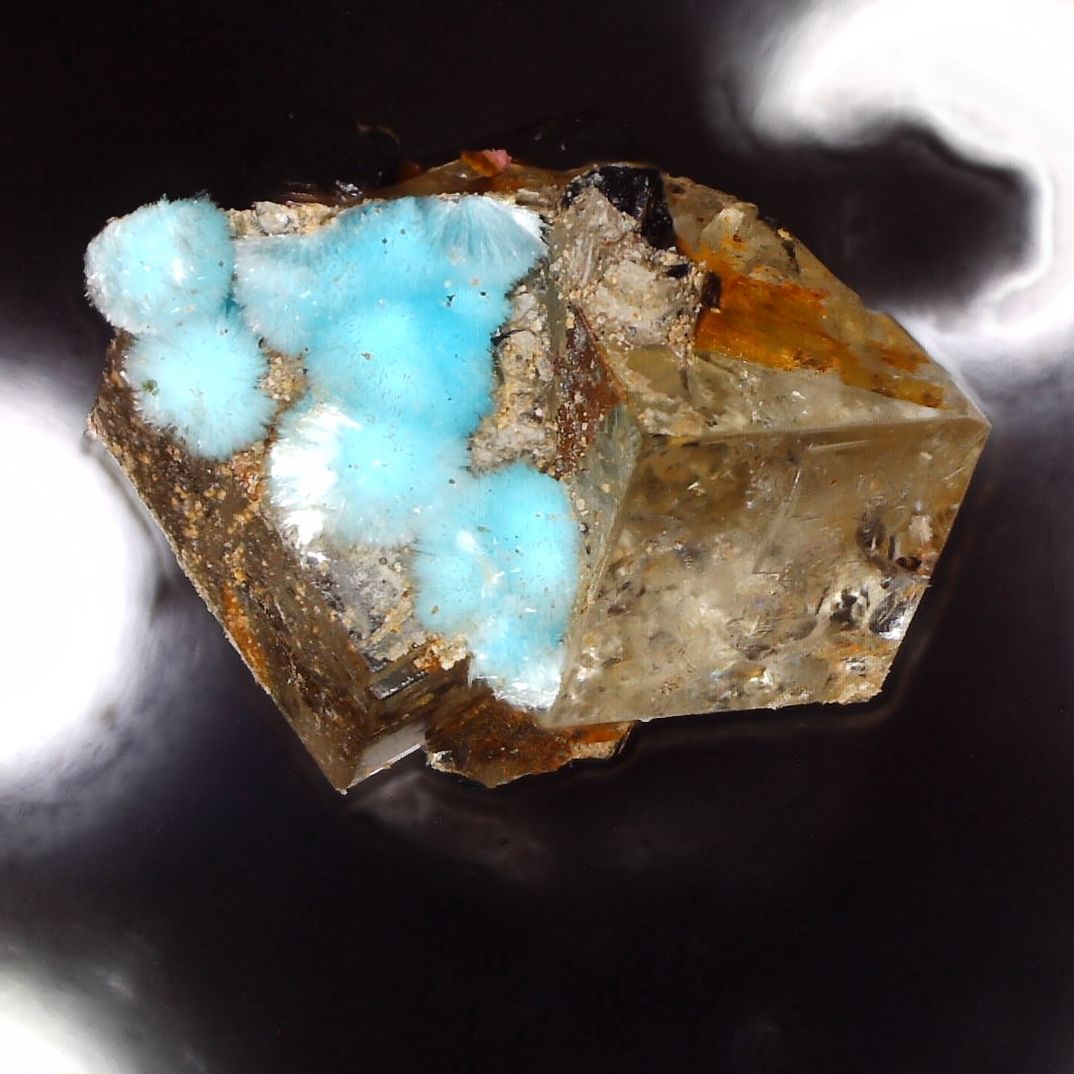 Very nice micromount specimen of aurichalcite and fluorite from Hilton Mine, Cumbria.
