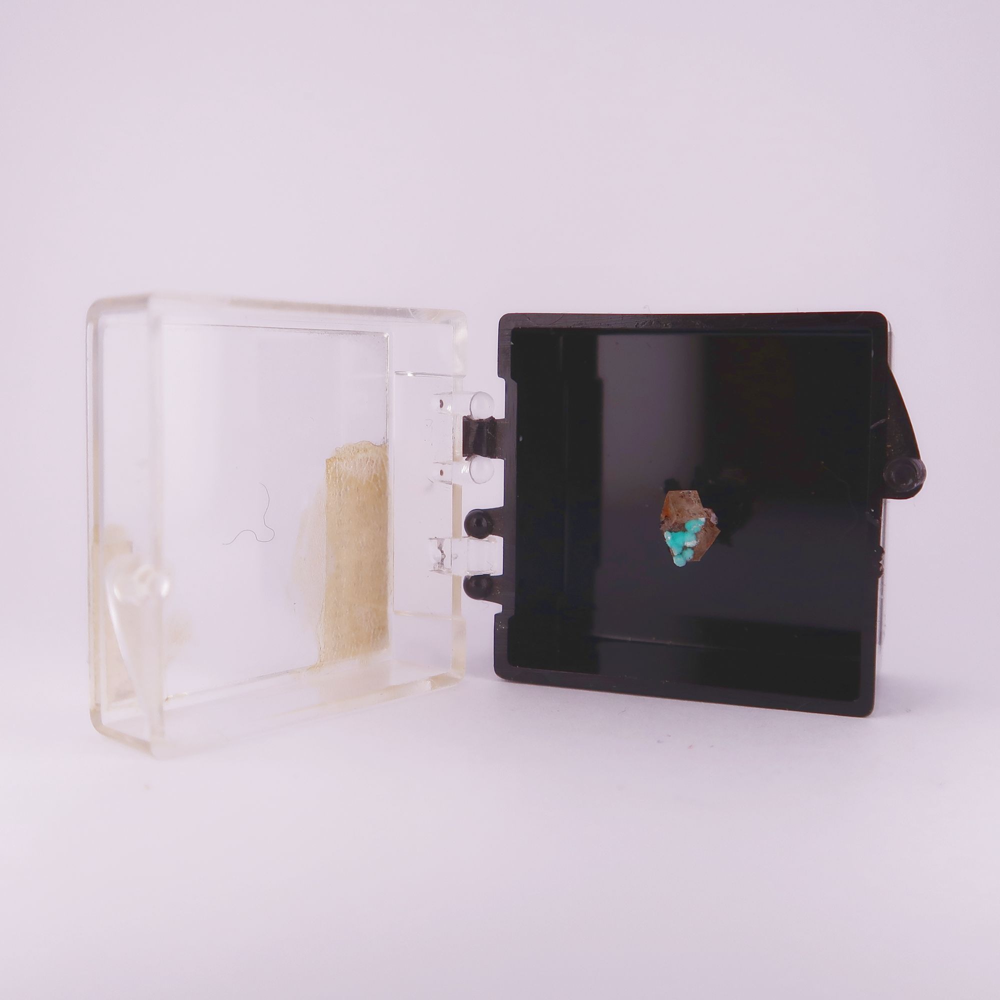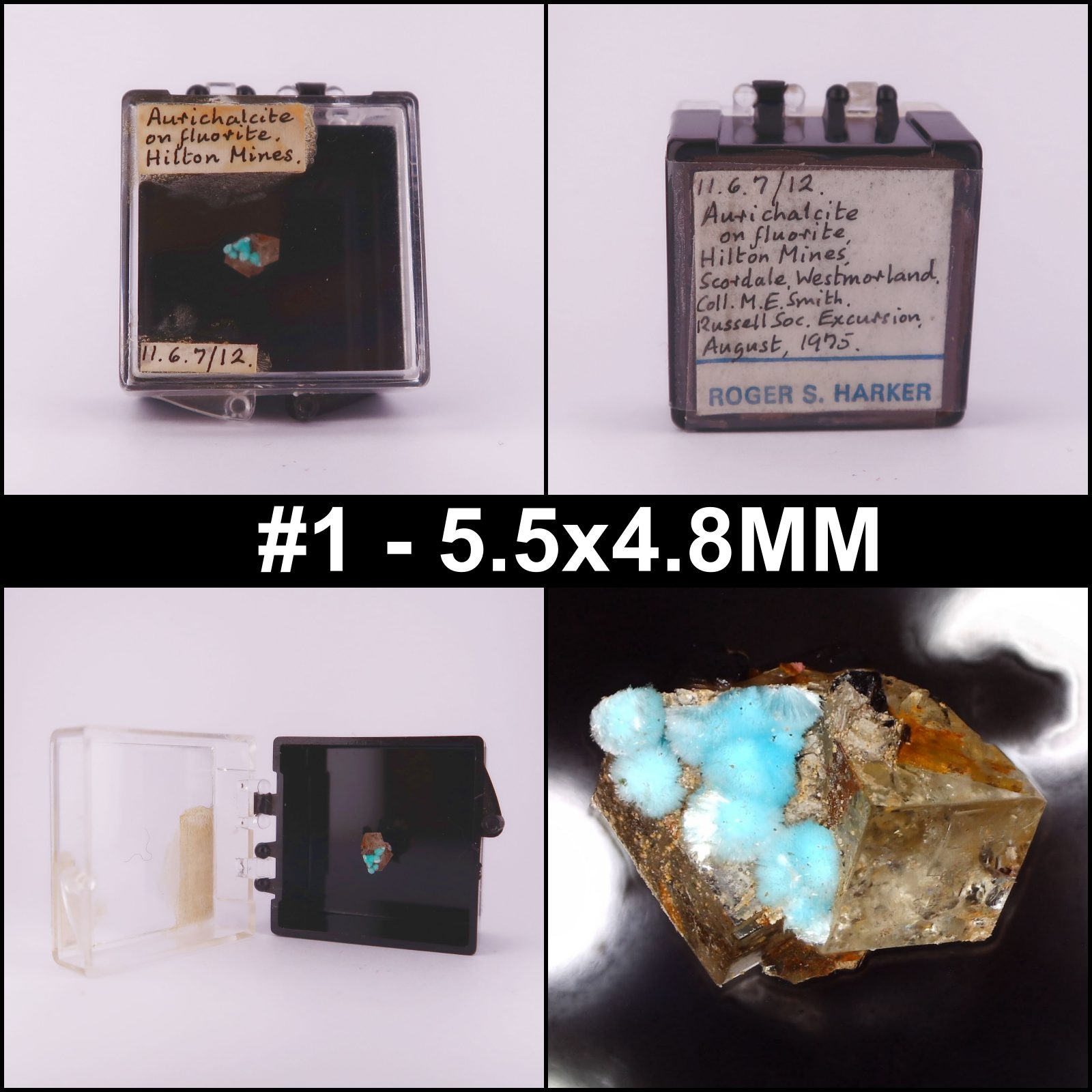 - #1 - this specimen was part of Roger Harkers collection and has three of his labels on. It is mounted with glue and can't be removed to be measured fully. The labels are glued to the box; one was loose and has been re-attached with a conservation grade tape. Ex. Roger Harker, M.E. Smith collections.