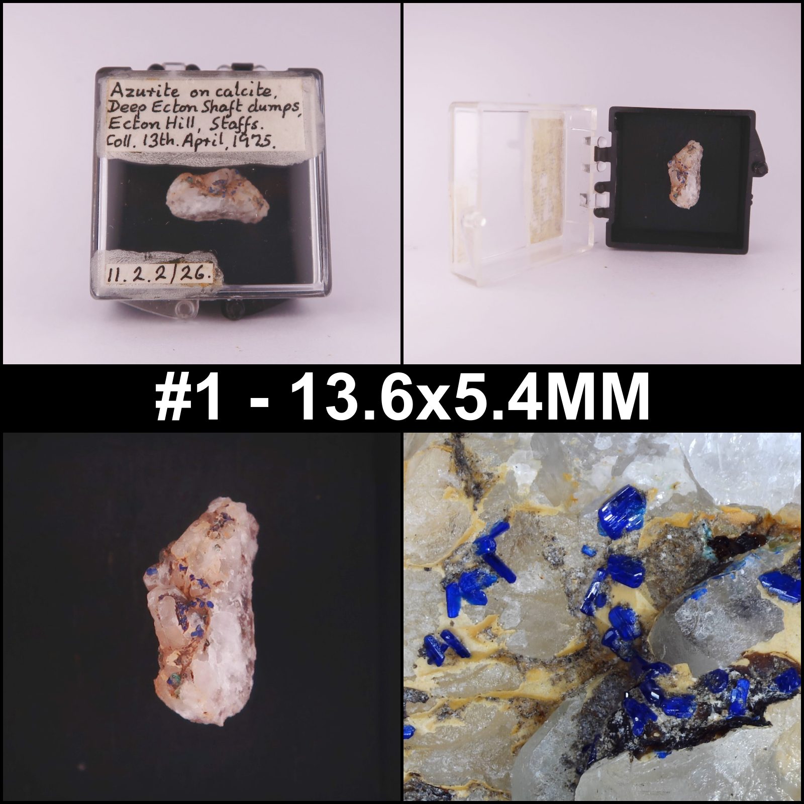 Nice specimen of deep blue Azurite on a white calcite matrix from Ecton Mine, Staffordshire.