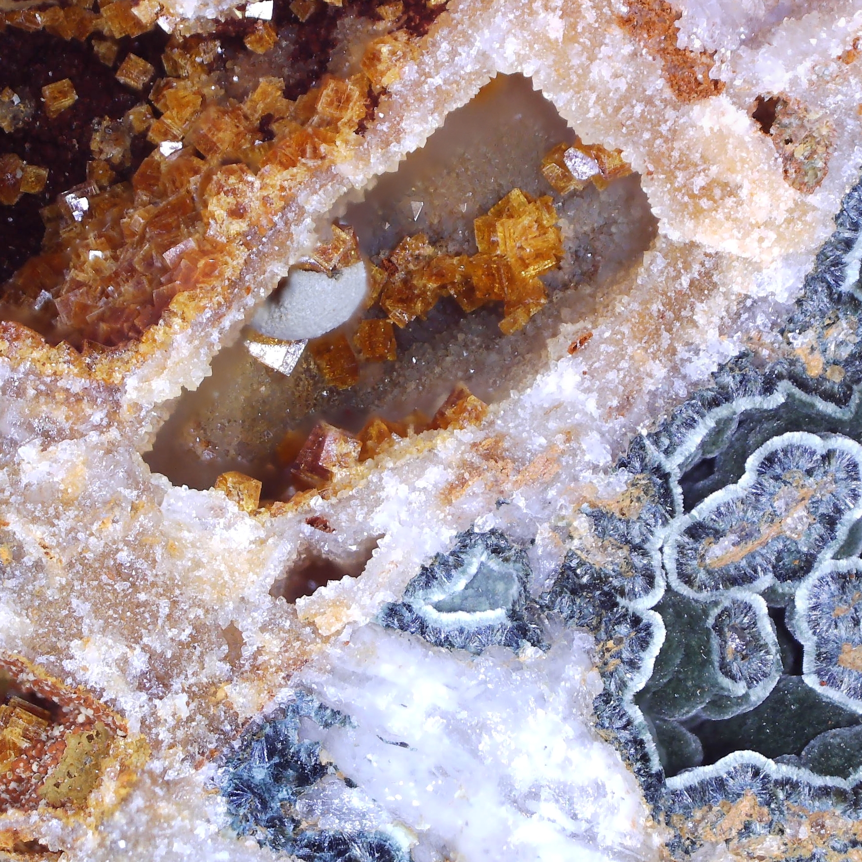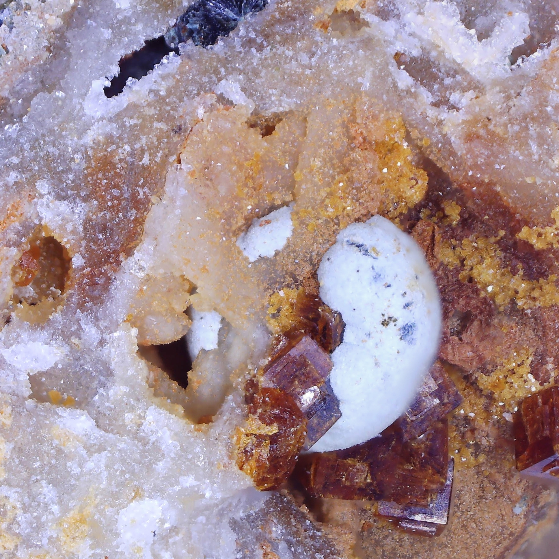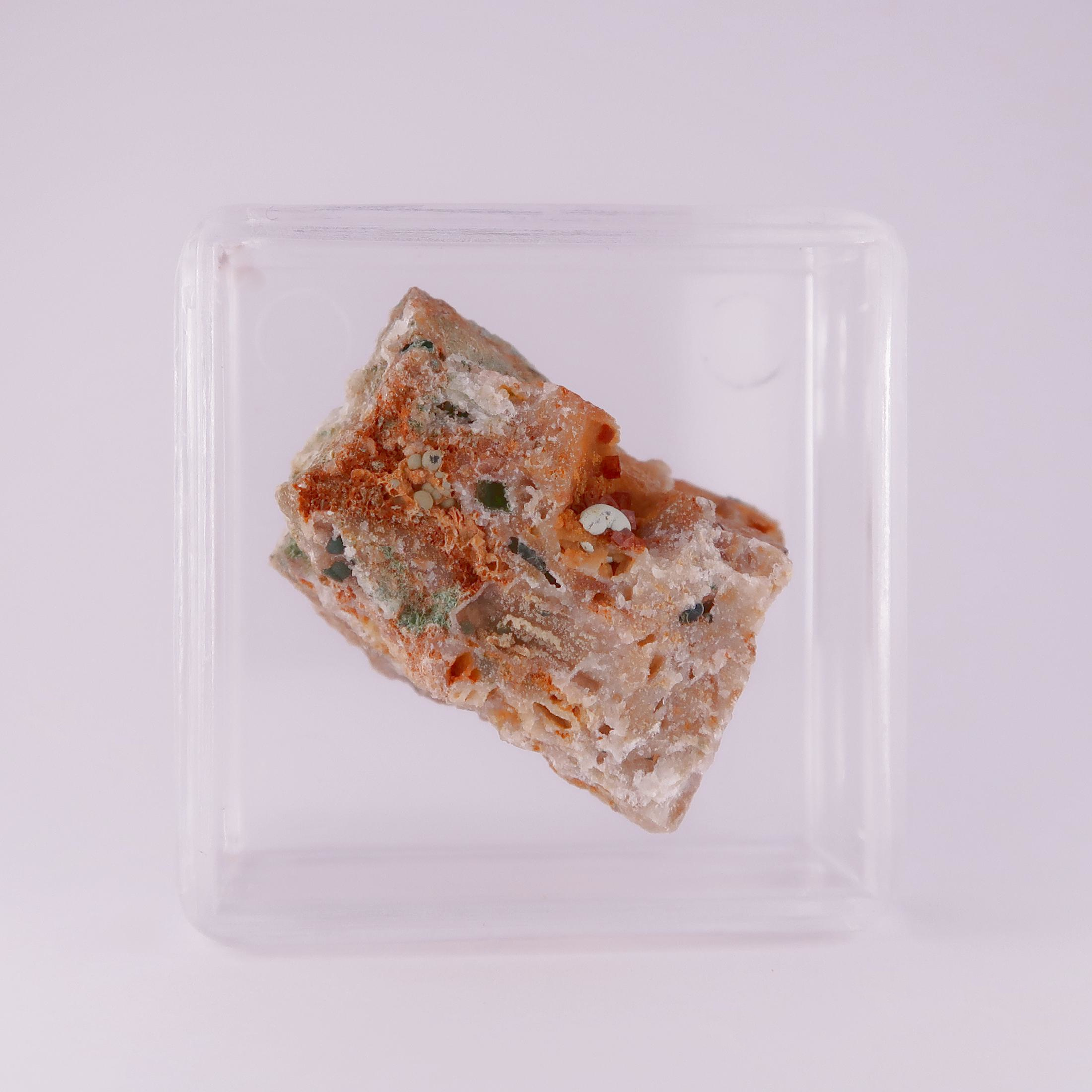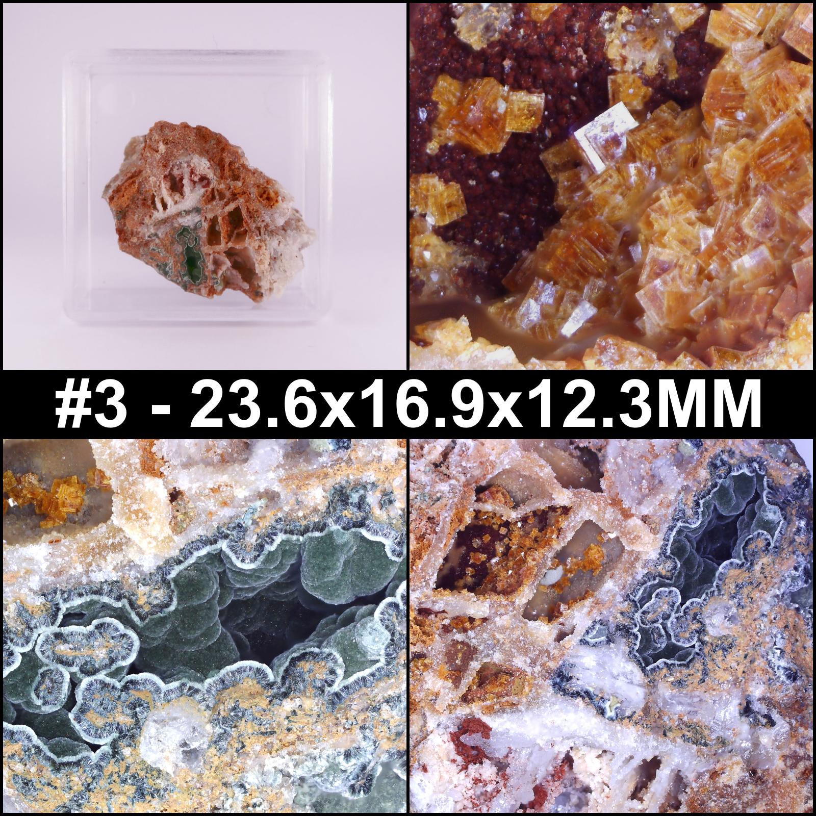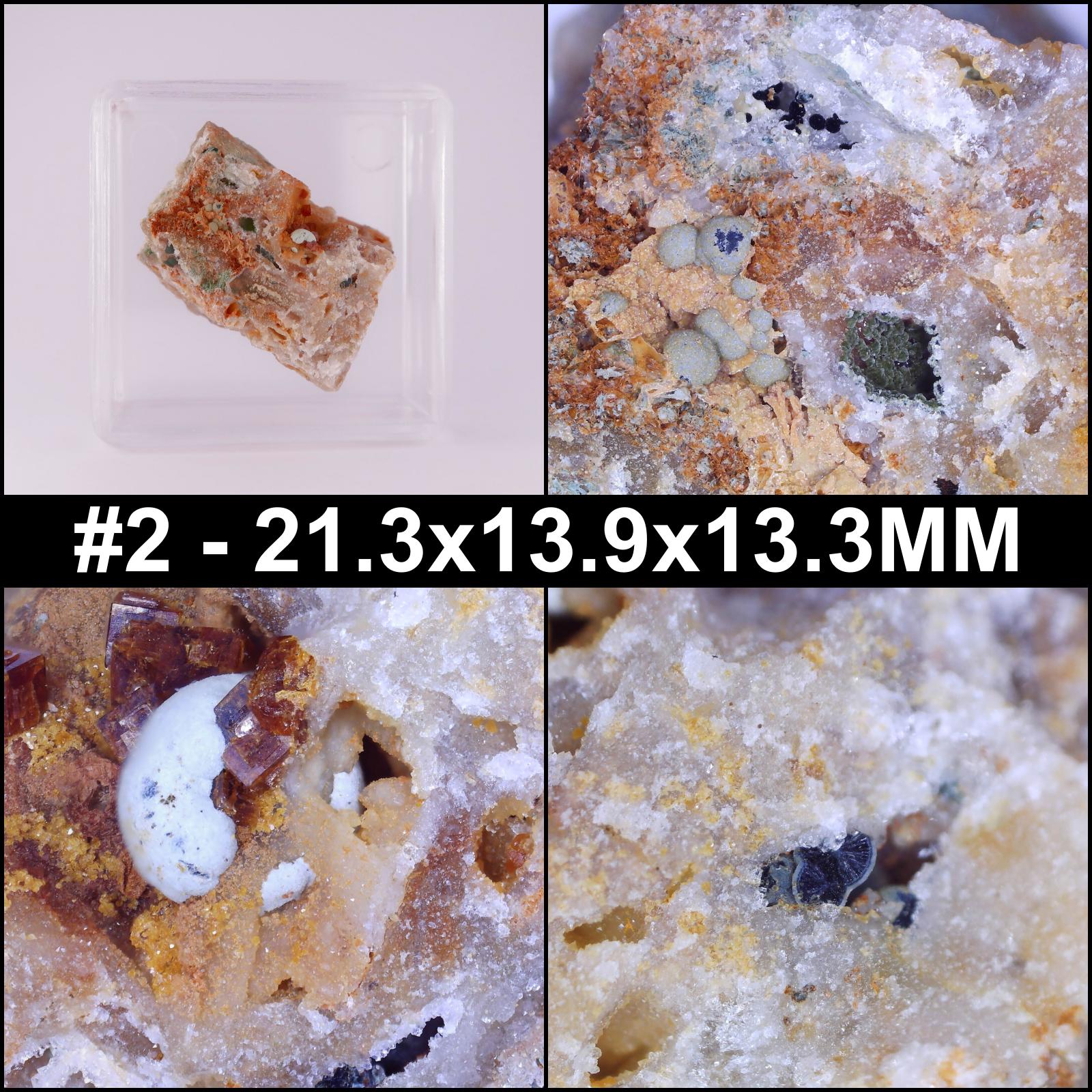 - #1 - 16x15.6x13.7MM - Typical specimen from the site, lots to look at including several vugs of minerals, some unidentified. Comes with a former owners label and our ID label.