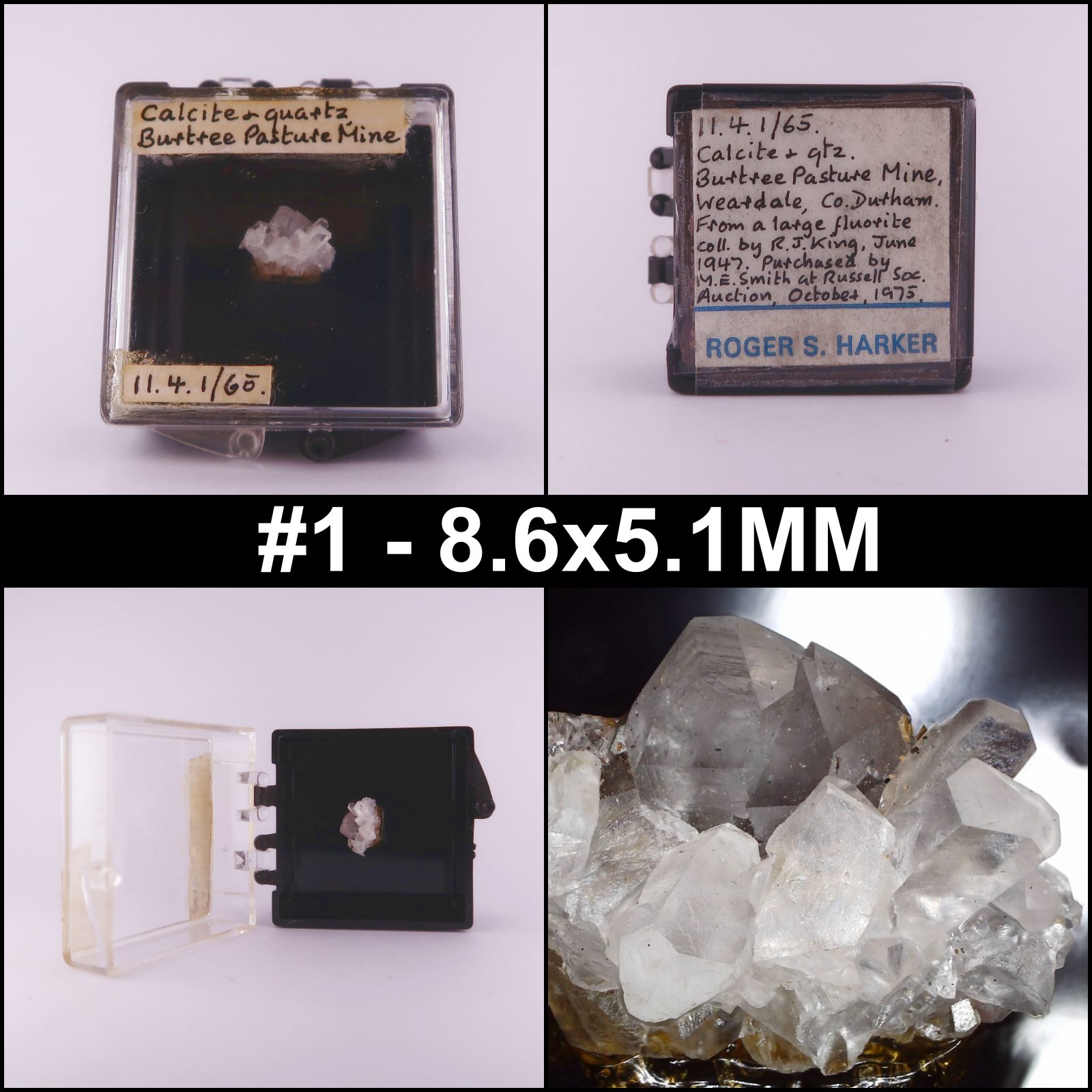 - #1 - this specimen was part of Roger Harkers collection and has three of his labels on. It is mounted with glue and can't be removed to be measured fully. The labels are glued to the box; one was loose and has been re-attached with a conservation grade tape. Some interesting names on this specimen - Ex. Roger Harker, R.J. King, M. E. Smith collections - earliest date on the label is 1947.