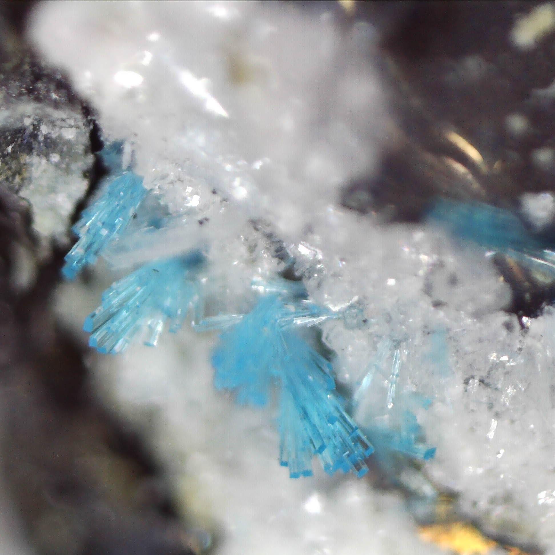 Exceptional neon blue crystals visible under high magnification - which is essential for this specimen.