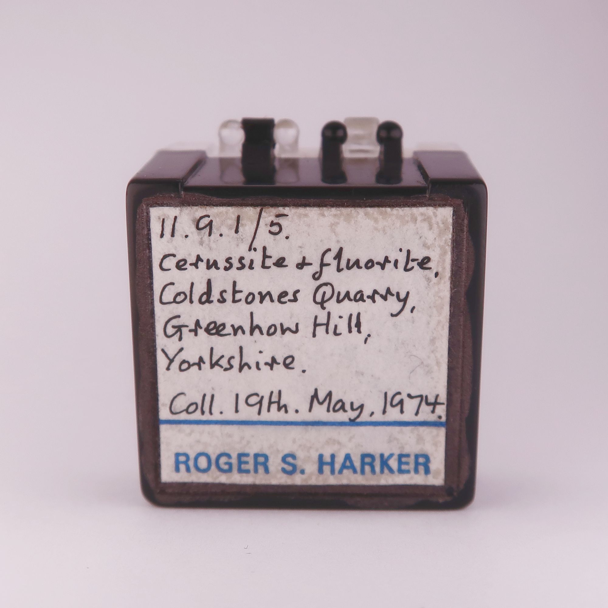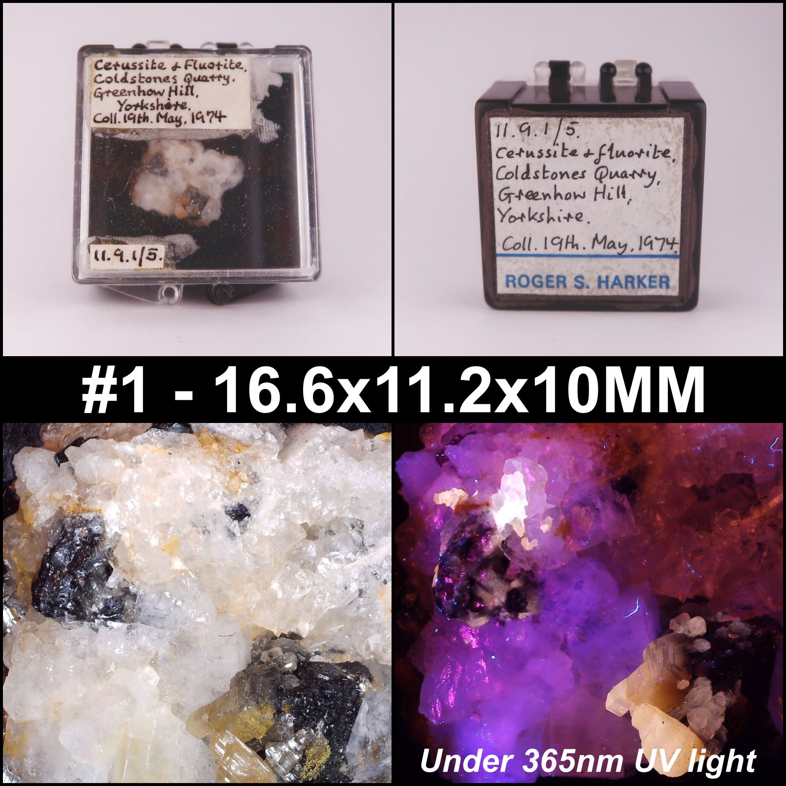 #1 - This specimen was part of Roger Harkers collection and has three of his labels glued to the perky box it comes mounted in. The specimen was once mounted with glue into the box but this had failed, so the specimen has been remounted with mineral tack. Ex. Roger Harker collection.