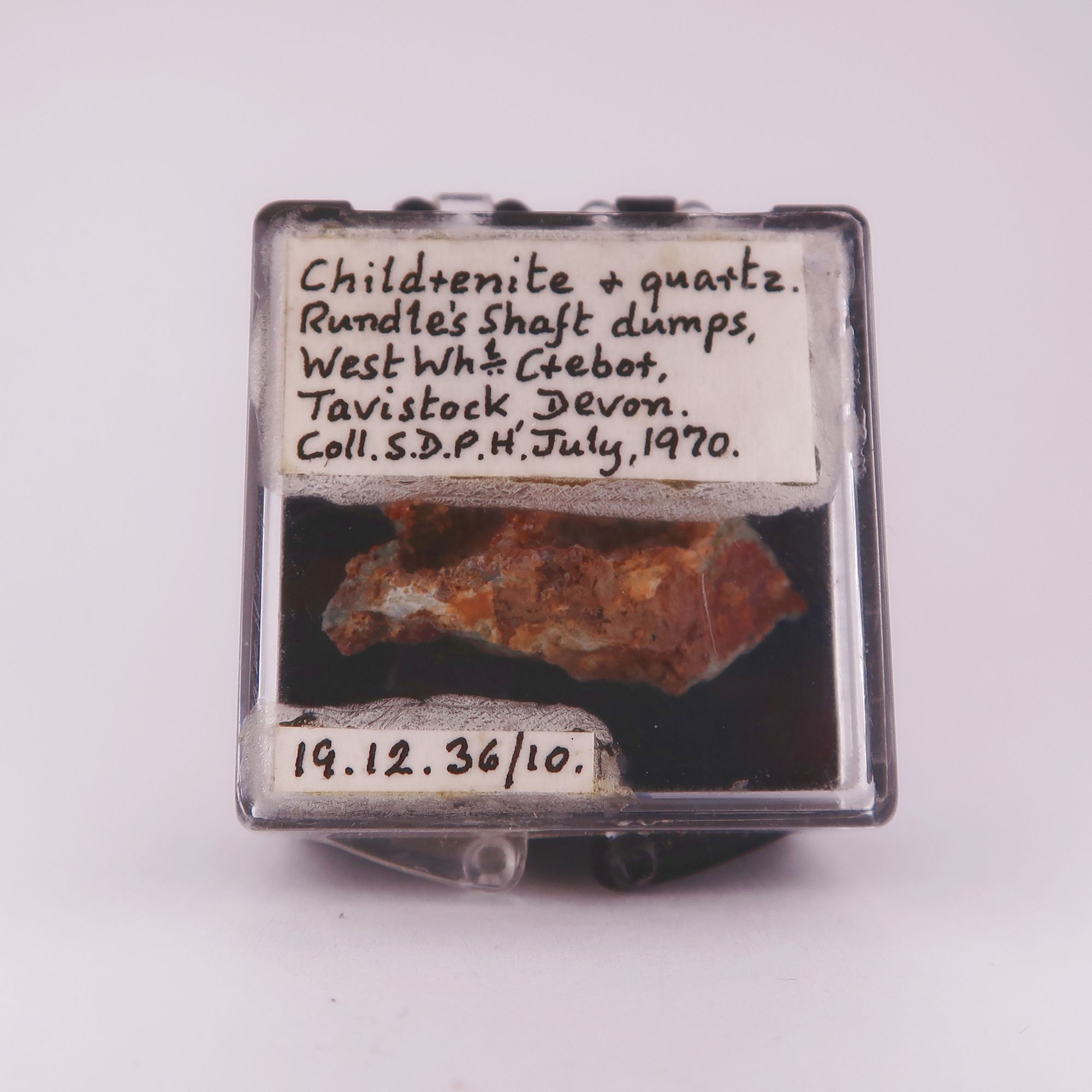 Nice thumbnail specimen of childrenite and quartz from West Wheal Crebor, Devon. Labelled as being collected 1970 from the dumps of Rundles Shaft.
