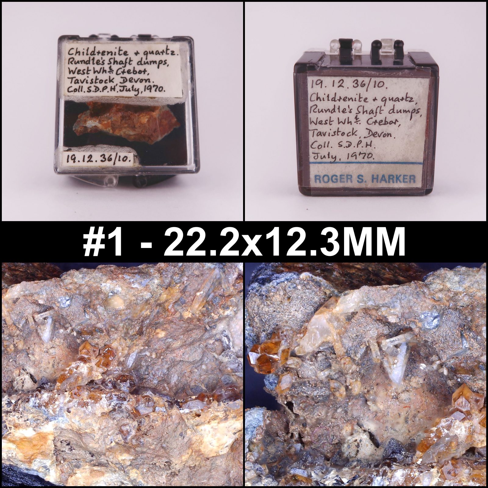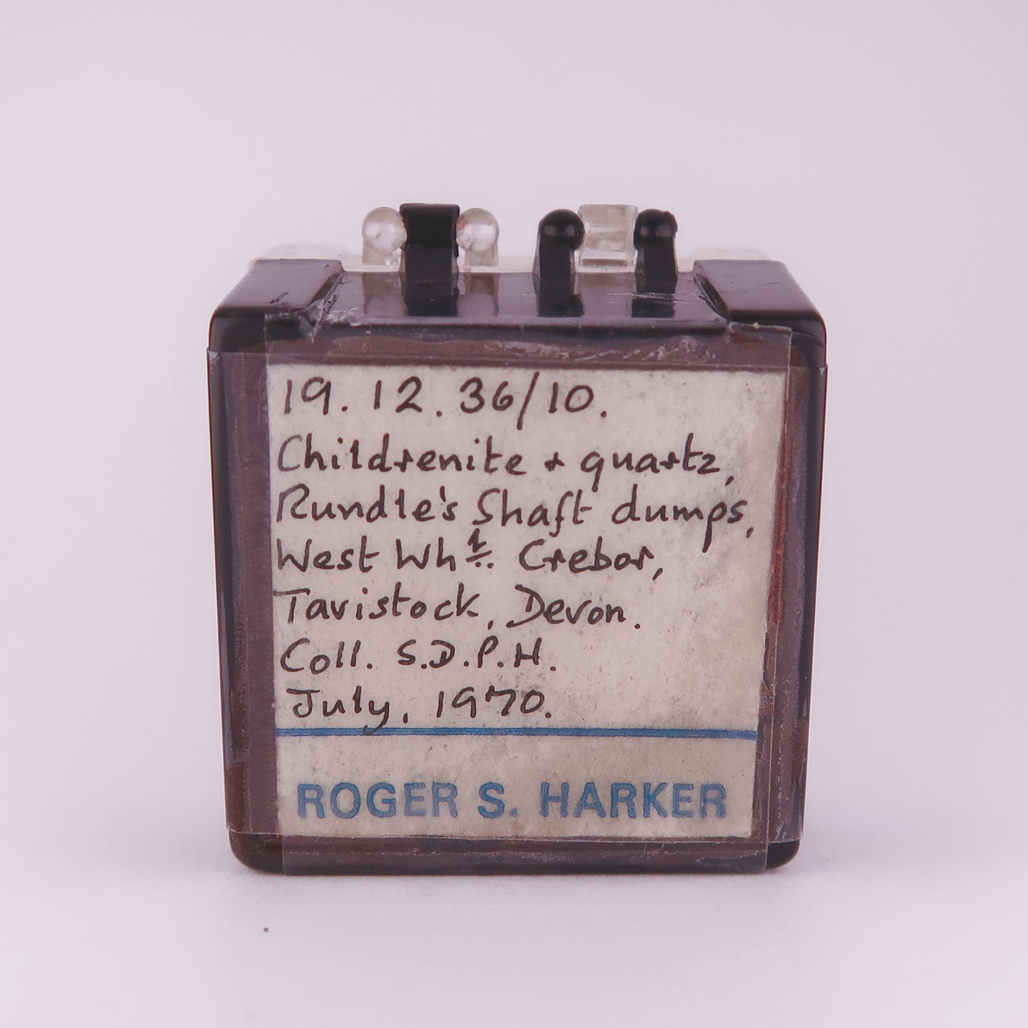 #1 - This specimen was part of Roger Harkers collection and has three of his labels glued to the perky box it comes mounted in. One had detached and has been stuck back on with a conservation grade tape.