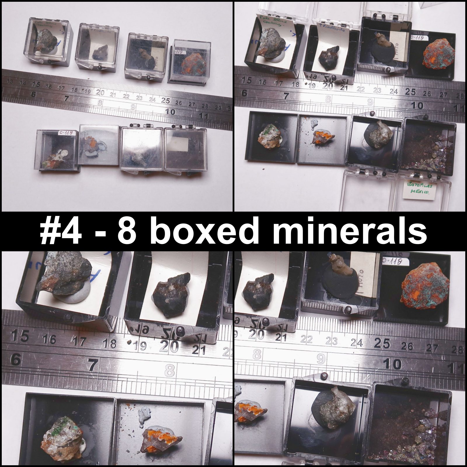 - #4 - 8 boxed minerals, primarily unlabelled.