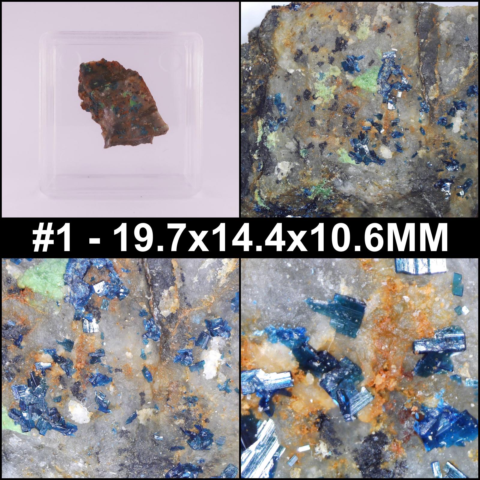 Comes boxed with our ID label and a former owners label. The former owner identified this as Clinoclase and Malachite, but I suspect from the colour and the locality that the green mineral is conichalcite.