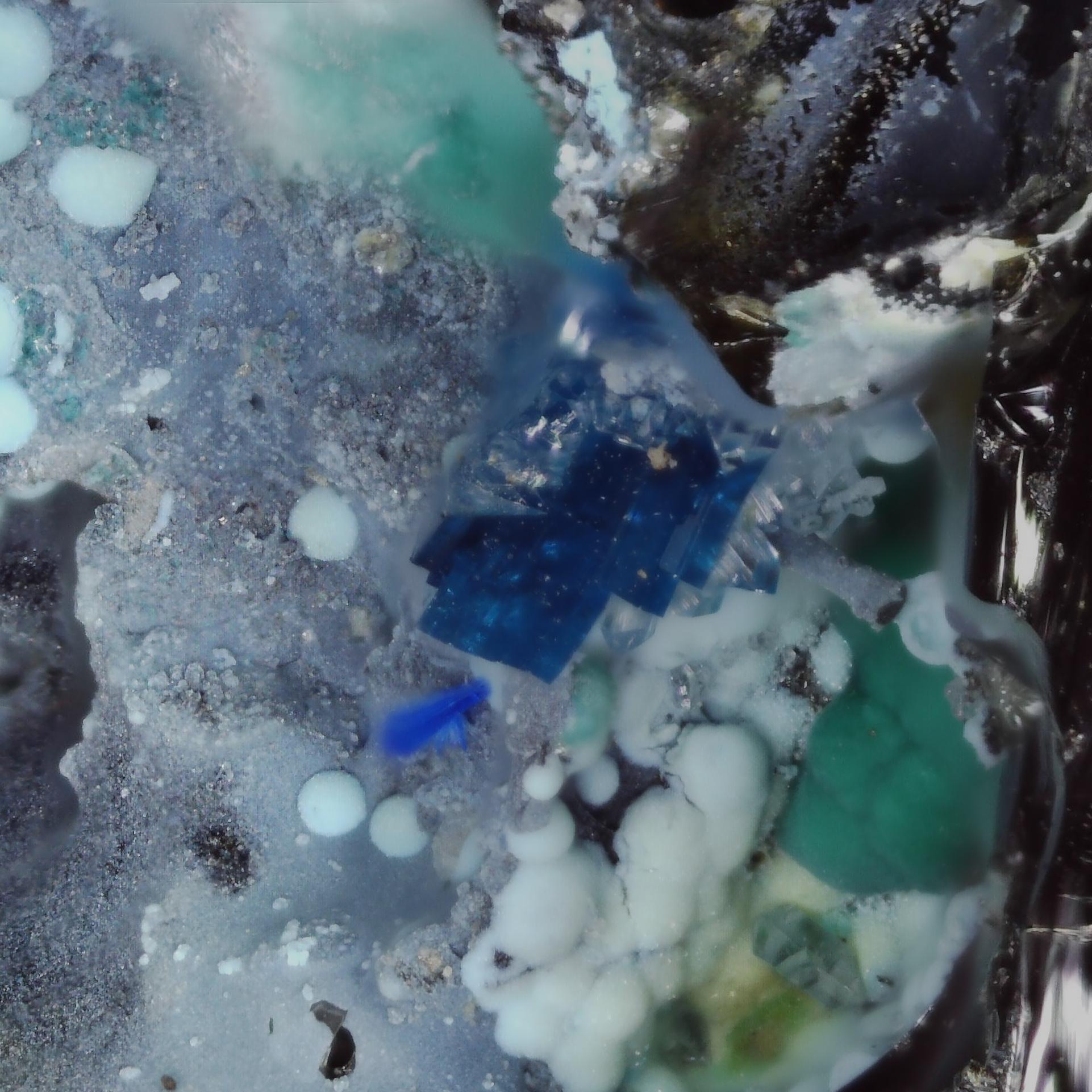 Magnification is absolutely essential for this specimen and will reveal other minerals - looks like there's some malachite.