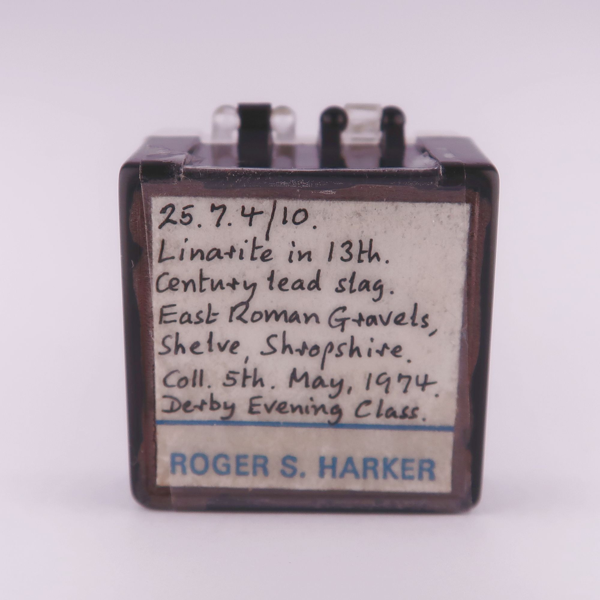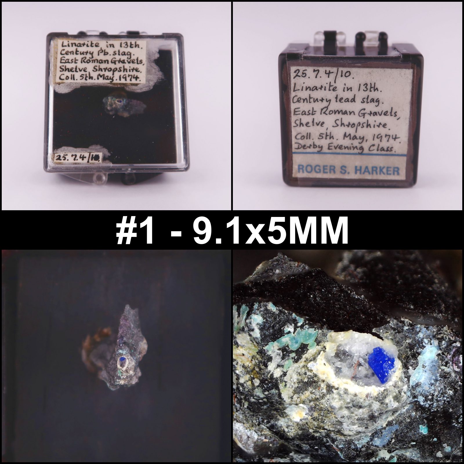#1 - Comes boxed with our ID label; this specimen was part of Roger Harkers collection and has three of his labels on. It is mounted with glue and can't be removed to be measured fully. The labels are glued to the box; one was loose and has been re-attached with a conservation grade tape. Ex. Roger Harker collection. Couple of other visible minerals.