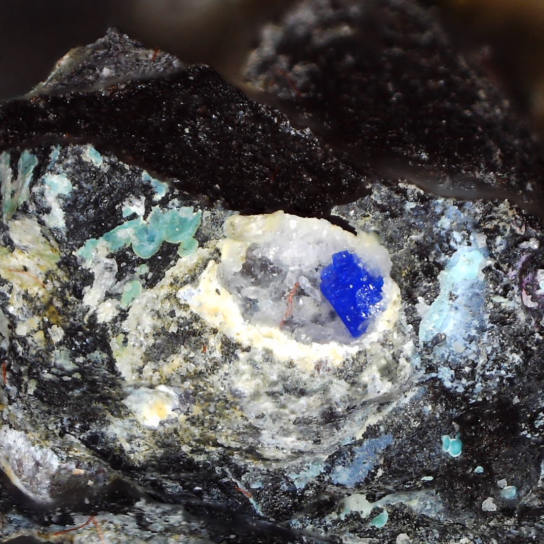 Linarite in slag from East Roman Gravels Mine, Worthen with Shelve, Shropshire, England, UK
