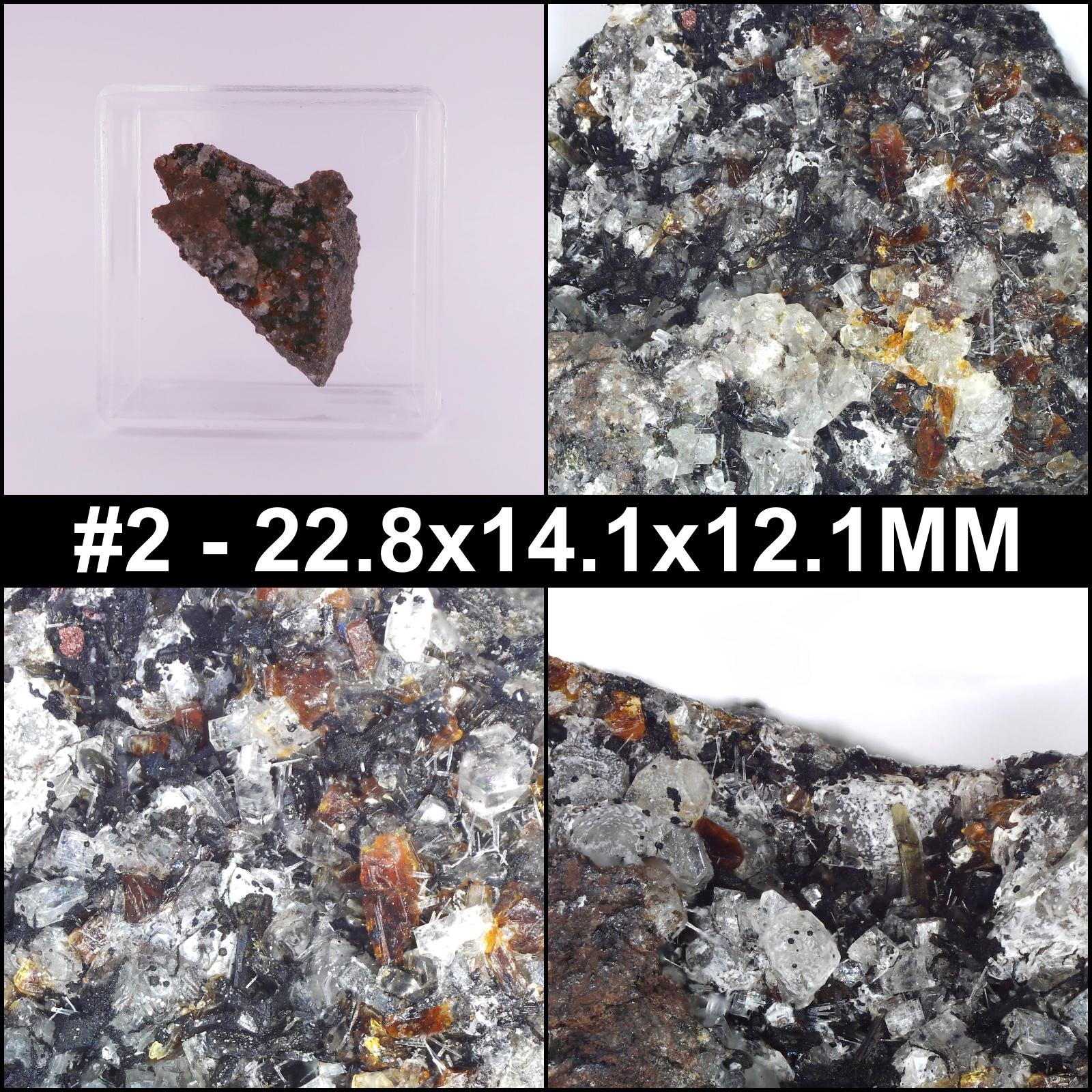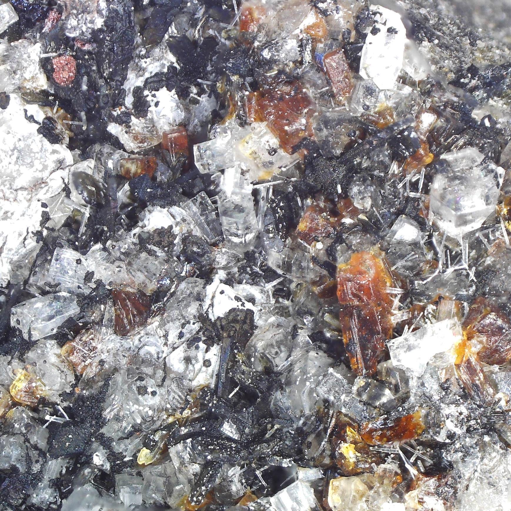 Magnification is absolutely essential here, and reveals a whole new world of micro crystals that can barely be seen with the naked eye. There are likely to be some other minerals here I didn't spot, or didn't want to list as confirmed.