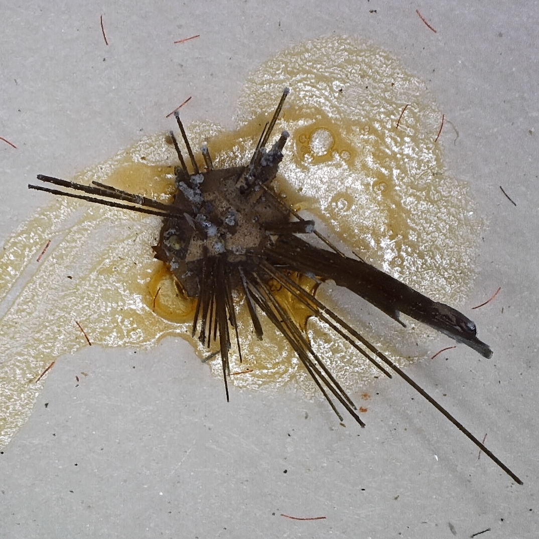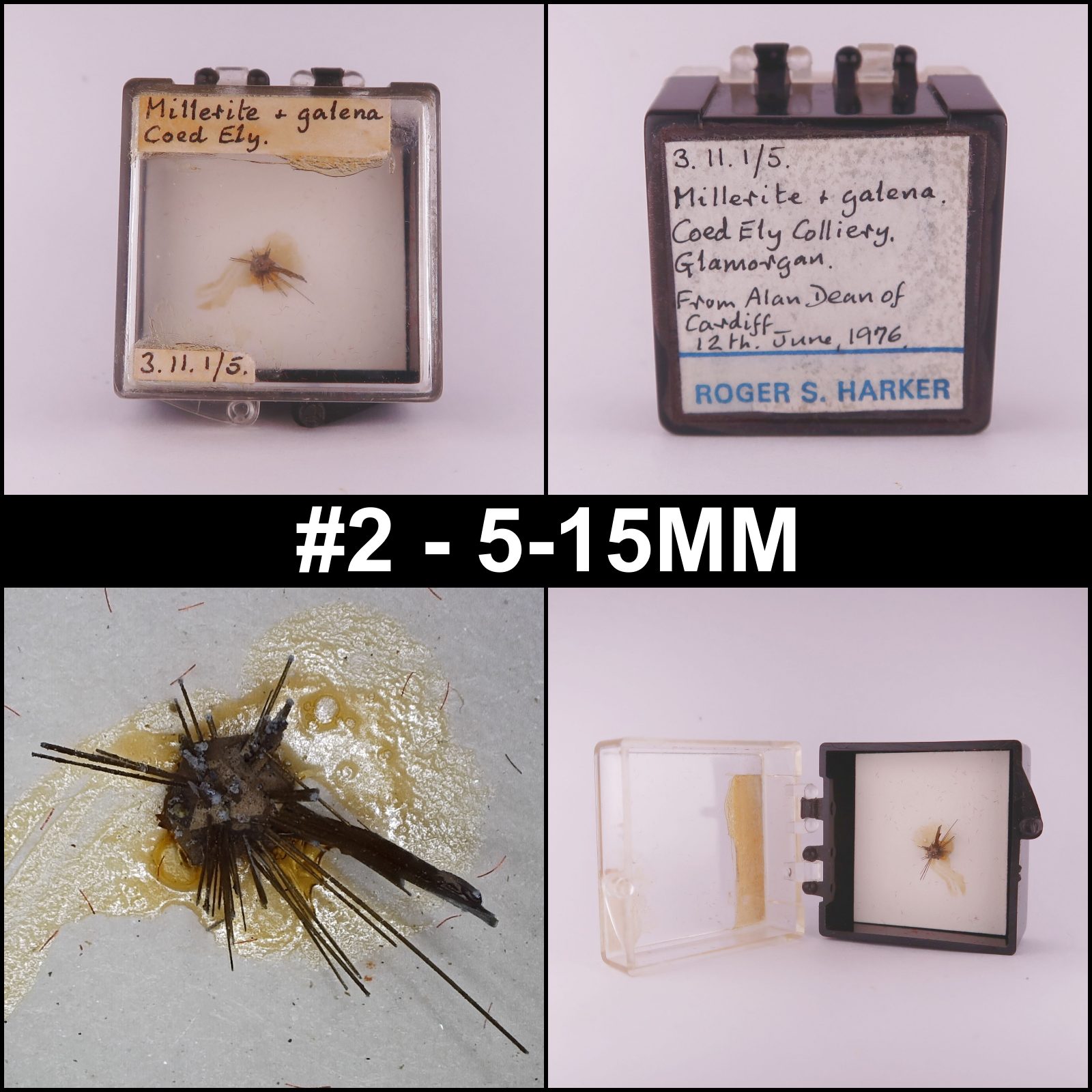 - #2 - unmeasurable, 5-10MM - fantastic micro of millerite. This specimen was part of Roger Harkers collection and has three of his labels glued to the perky box it comes mounted in. The specimen is mounted with glue onto paper/card. The labels are glued to the box. Ex. Roger Harker, Alan Dean collections.