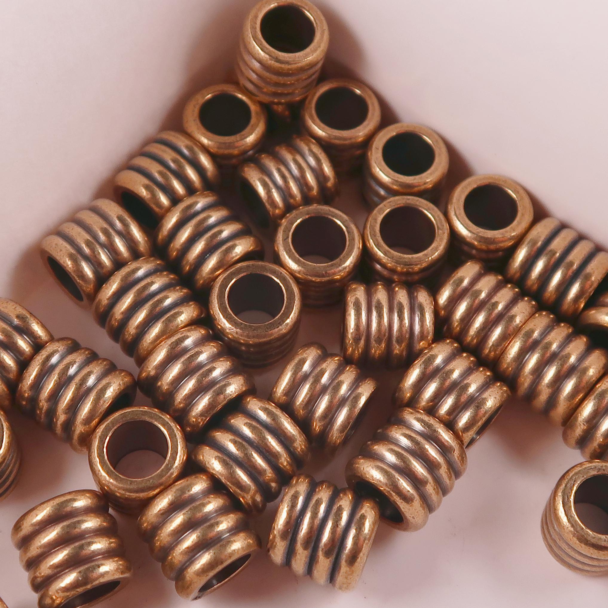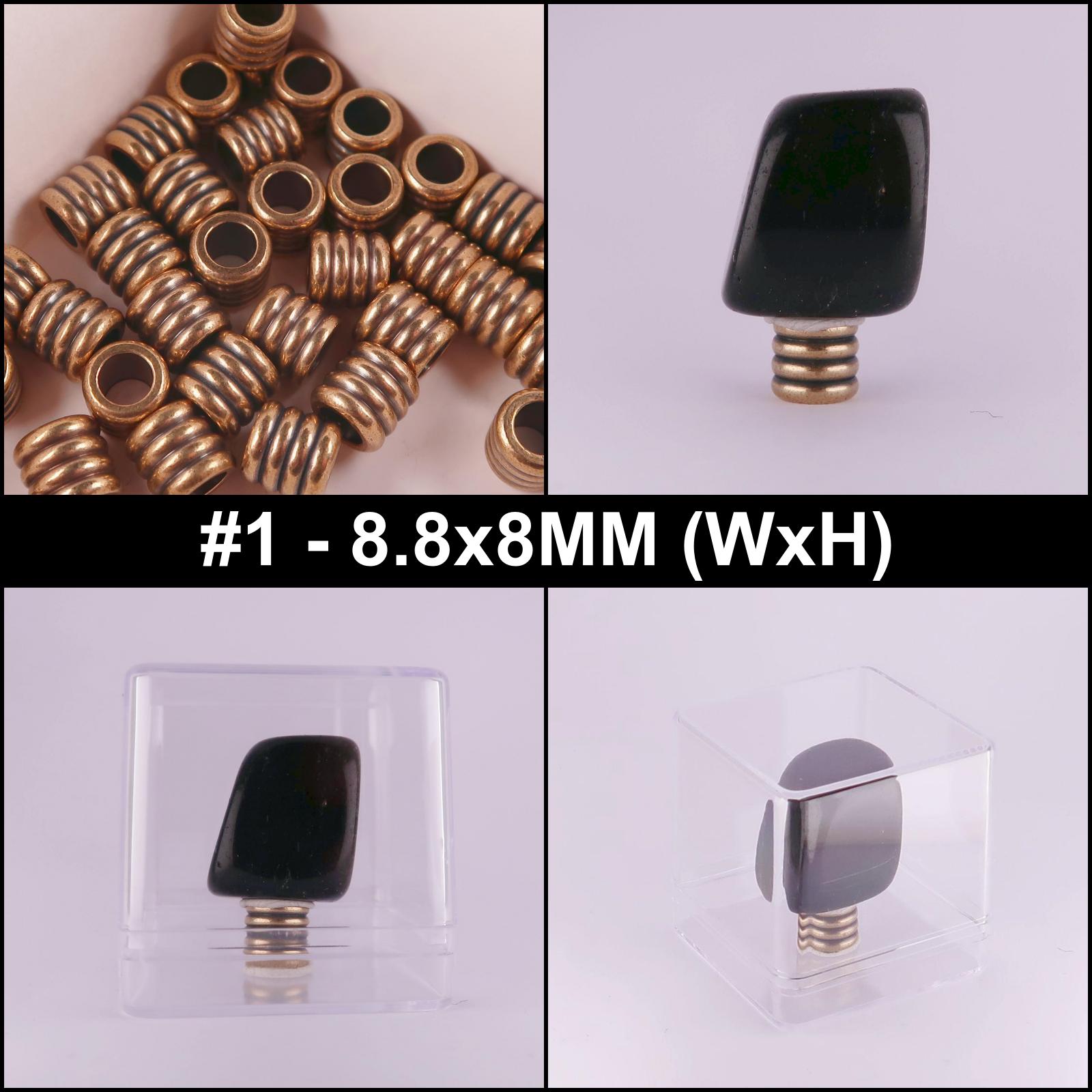 - #1 - 8.8MM wide x 8MM tall - ribbed cylinders, intended as beads. The bead holes are 5.3MM, which is quite big, so you'll need quite a bit of mineral tack. Good for the nicest specimens. Sold as a packet of five.