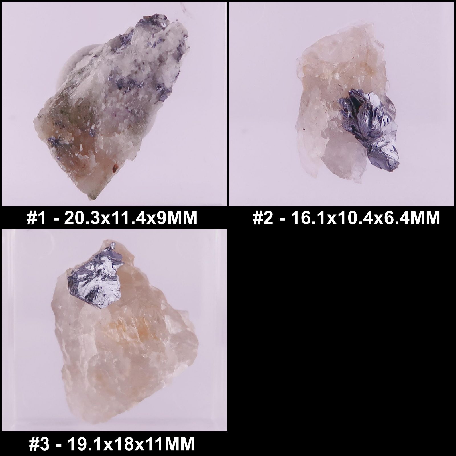 Nice thumbnail sized specimens of Molybdenite on a quartz matrix from Mont Saint-Hilaire, Canada.