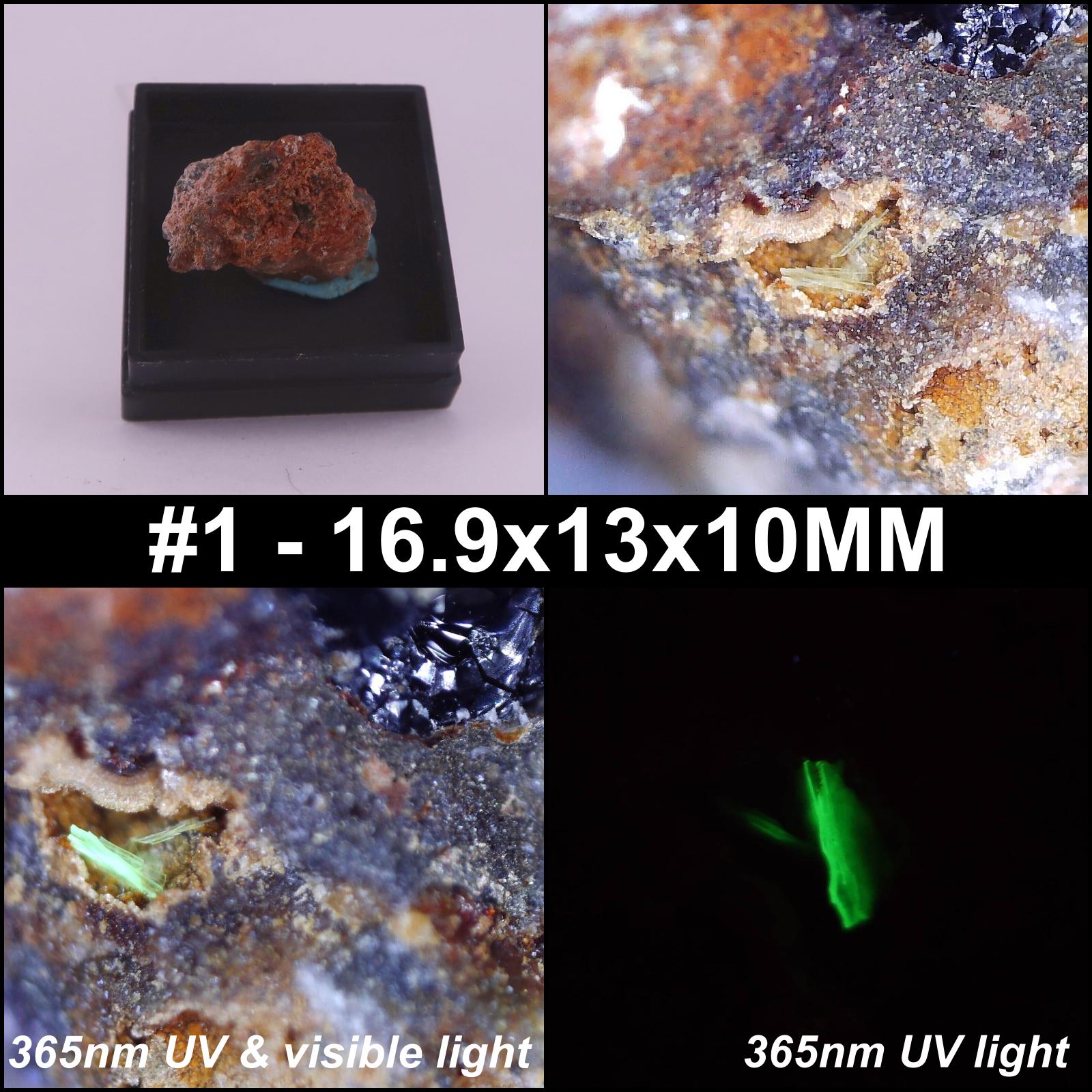 - #1 - 16.9x13x10MM - nice little piece, single Nováčekite crystal on matrix. Box is labelled 'Nováčekite and Arsenosiderite' but with no locale information unfortunately. 0.3-0.4usv/hr at 0CM with a radiacode 2.