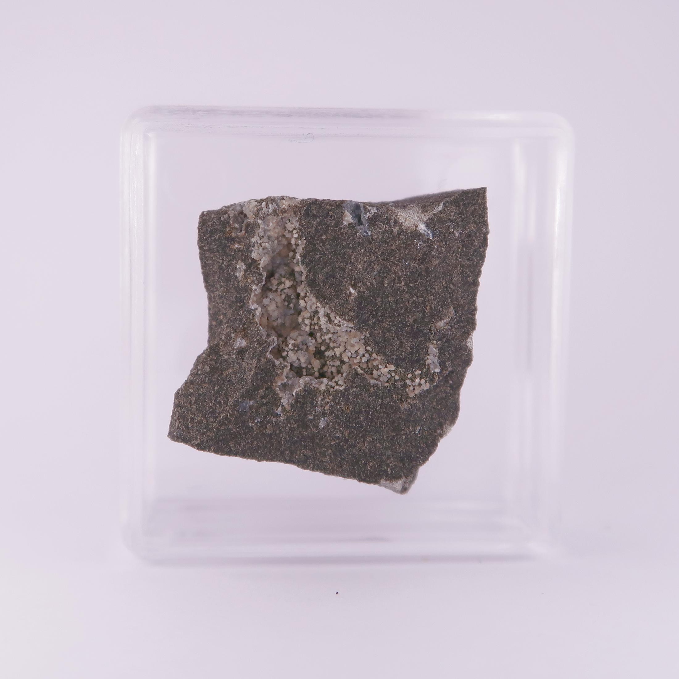 - #1 - 20.7x17.7x14.9MM - acceptable specimen, with phillipsite in a slight void on the matrix, alongside an unidentified needle-like crystal, possibly fluorapatite. Comes mounted in a display box with our ID label and a former owners label.