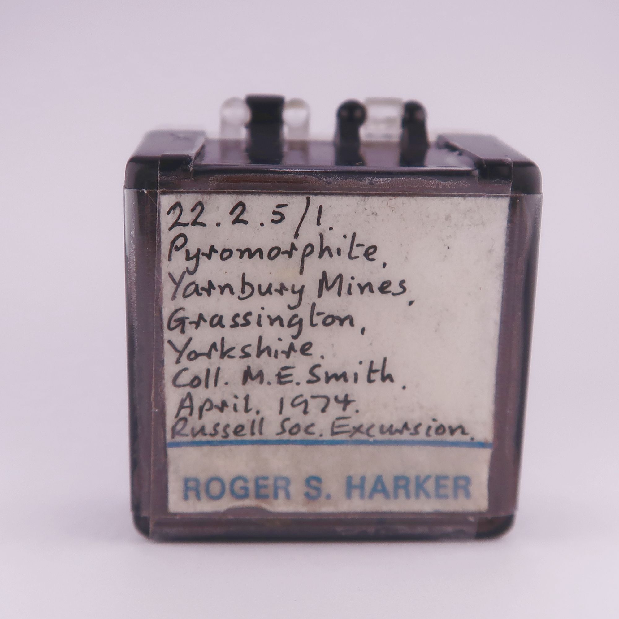 The specimen is mounted with glue into the box. Ex. Roger Harker collection. Marked as being collected Apr 1974 by M.E. Smith during a Russell Society trip.