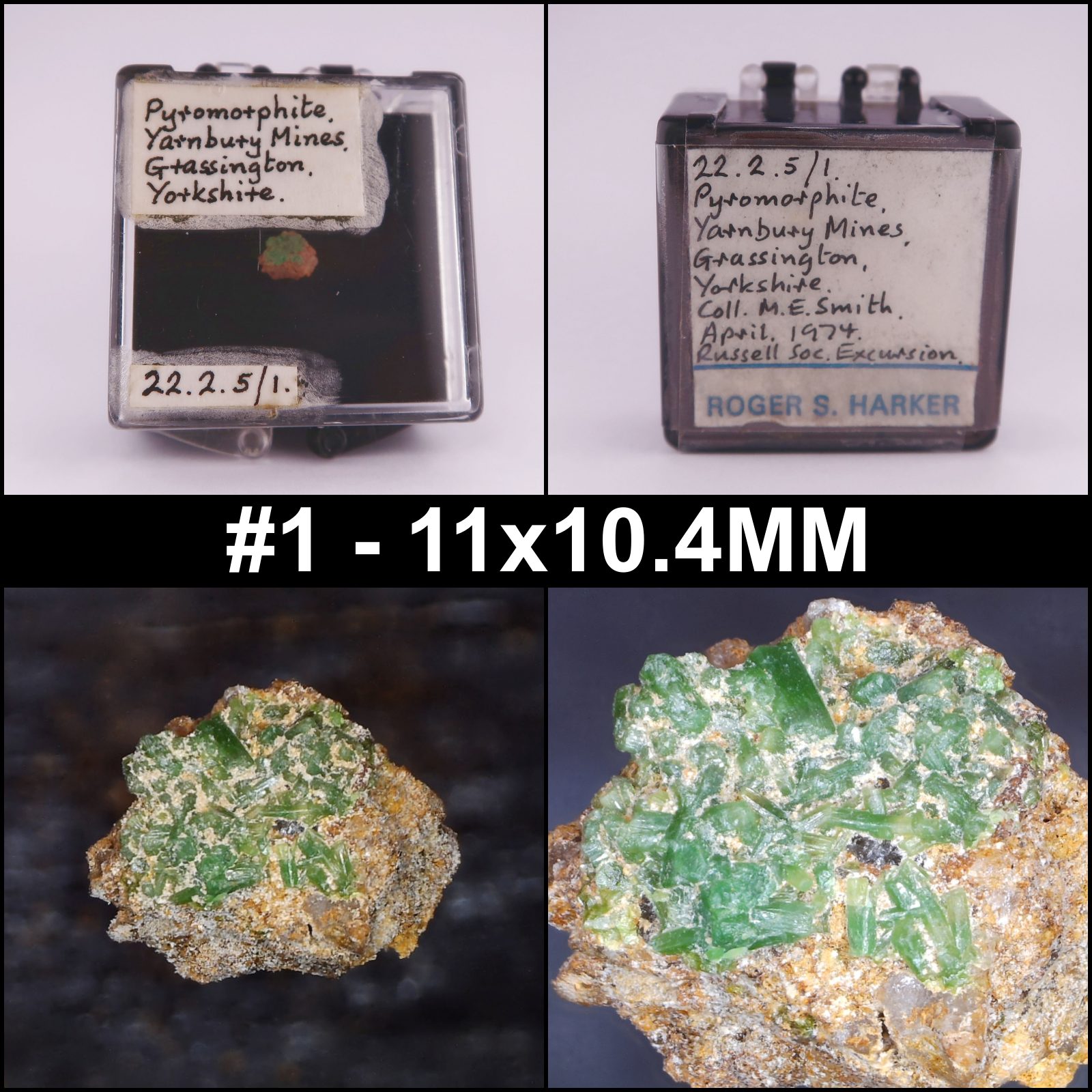 #1 - This specimen was part of Roger Harkers collection and has three of his labels glued to the perky box it comes mounted in. One had detached and has been stuck back on with a conservation grade tape.