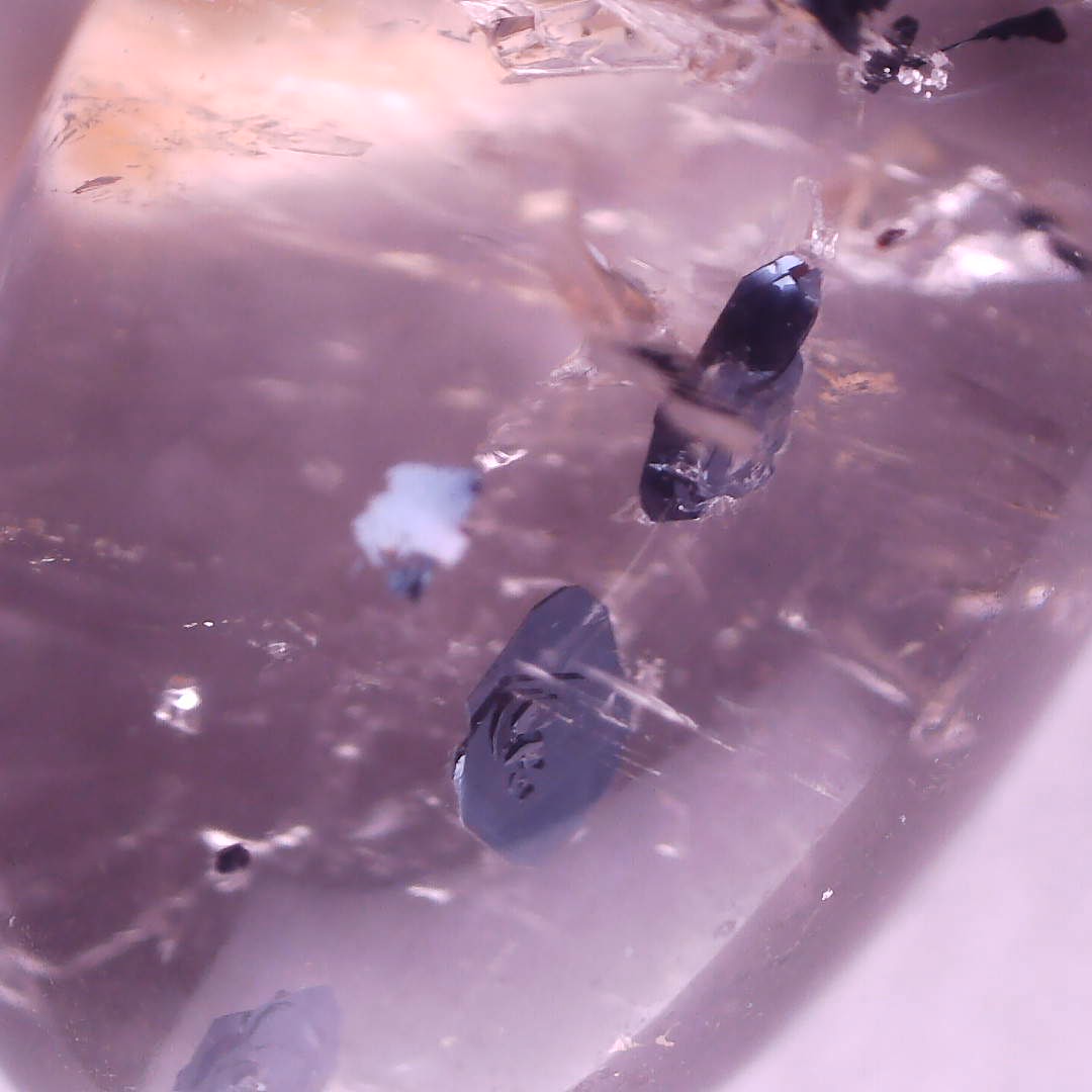 While iron is often found as a quartz inclusion, these are a little more special – hematite platelets in clear quartz.