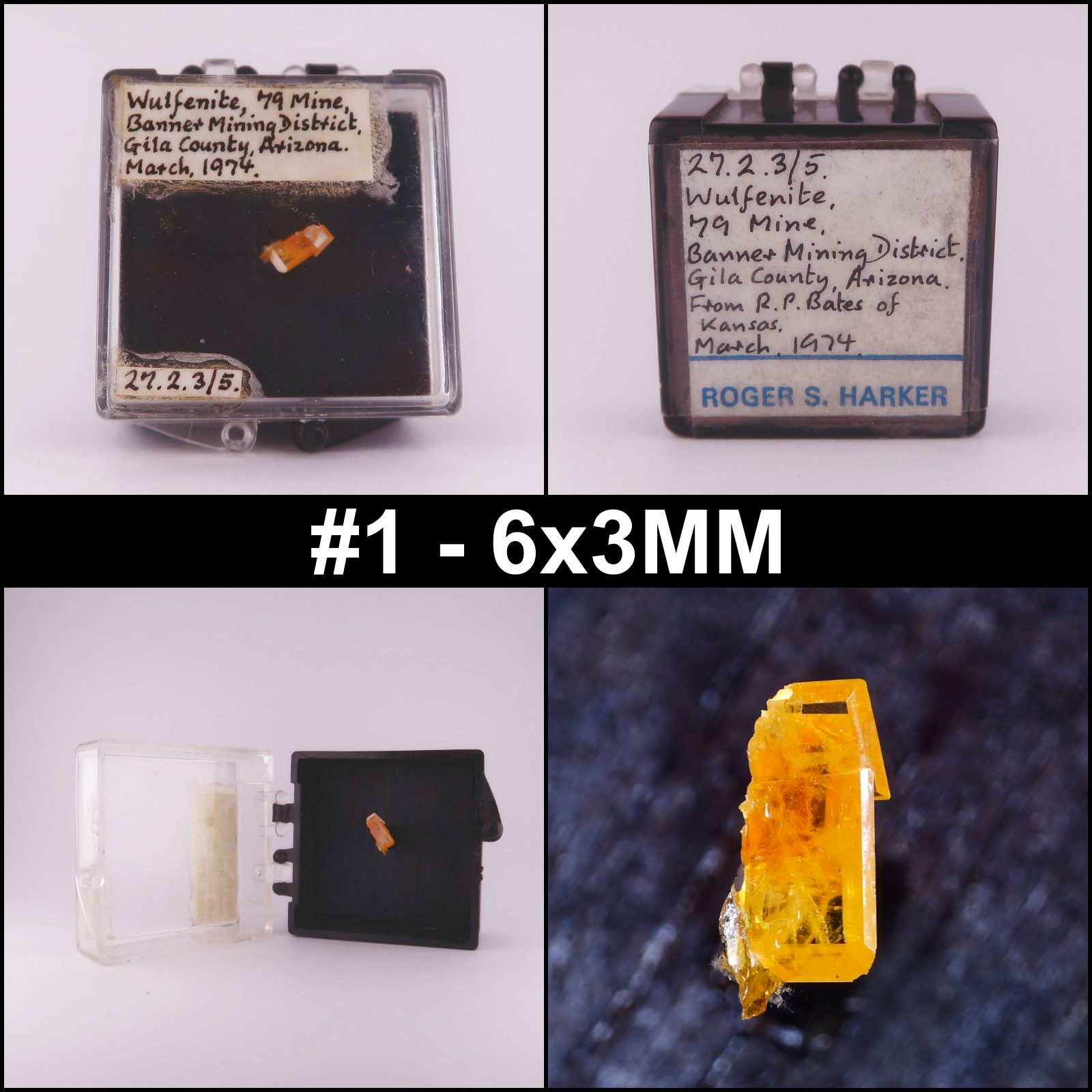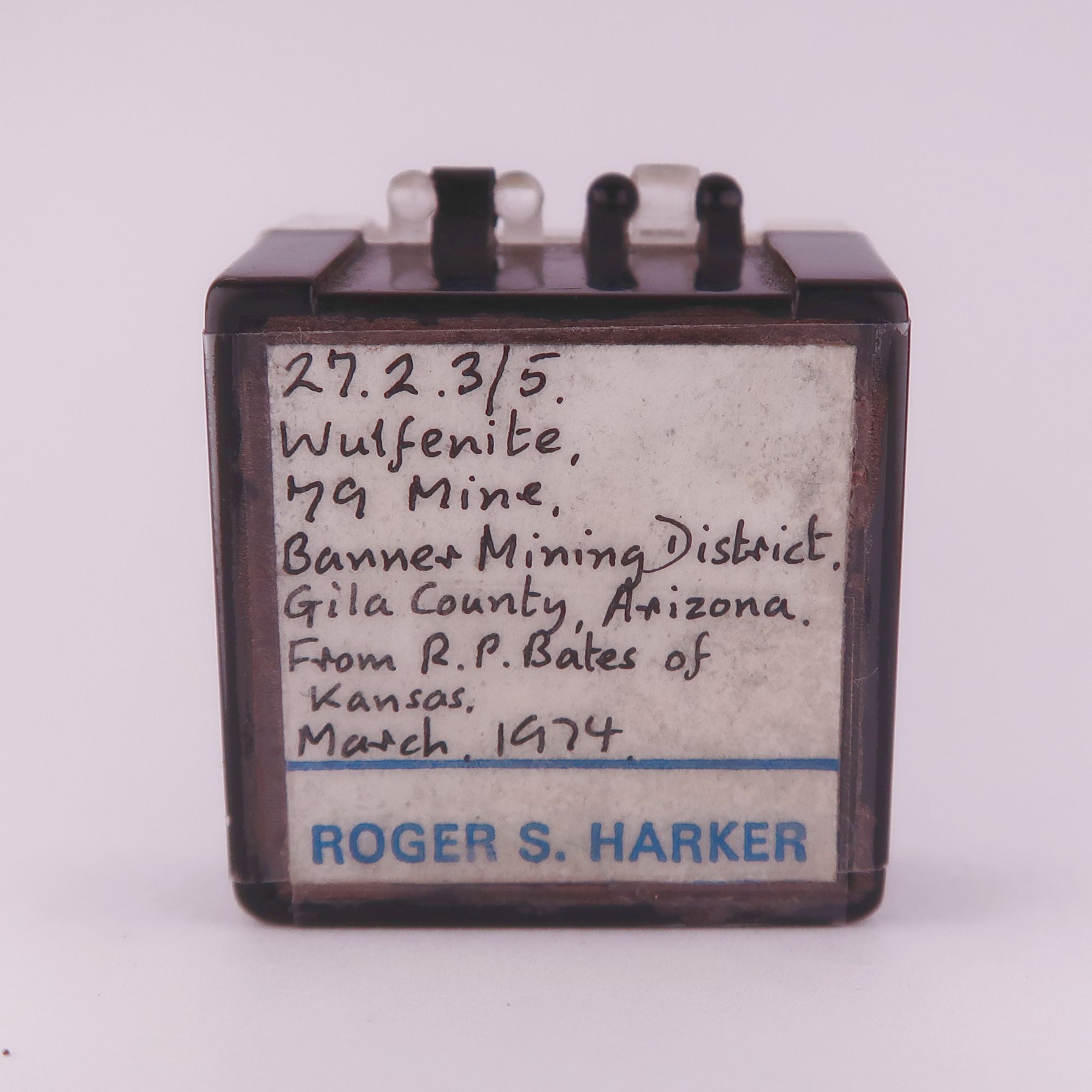 #1 - Comes boxed with our ID label; this specimen was part of Roger Harkers collection and has three of his labels on. It is mounted with glue and can't be removed to be measured fully. The labels are glued to the box; one was loose and has been re-attached with a conservation grade tape. Ex. Roger Harker, R. P. Bates collections.